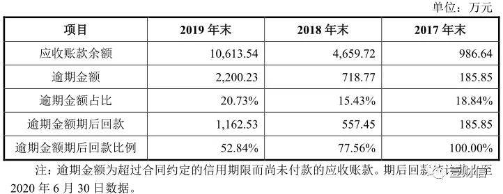 同时,芯碁微装在报告期内还存在应收账款逾期的情形,2017 年末、2018 年末和 2019年末,公司应收账款逾期率分别为 18.84%、15.43%和 20.73%,同期逾期金额的期后回款比例分别为100.00%、77.56%和52.84%。