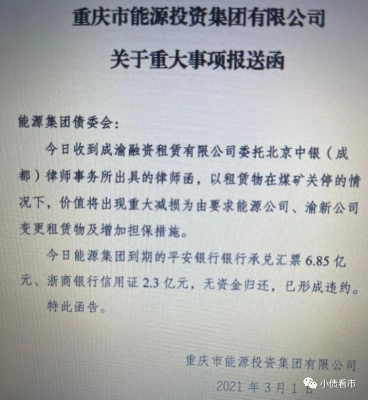 3月2日,一张关于重庆市能源投资集团有限公司(以下简称“重庆能源”)银承和信用证违约的报送函截图,在债券圈疯传引起广泛热议。