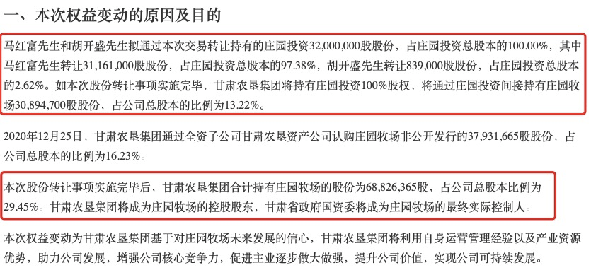 1月28日,庄园牧场发布权益变动报告书。报告显示,1月22日公司实控人马红富和自然人胡开盛与甘肃农垦集团签订了股权转让协议,甘肃农垦集团以4.27亿元的交易对价受让马红富和胡开盛合计持有的庄园投资100.00%的股权。