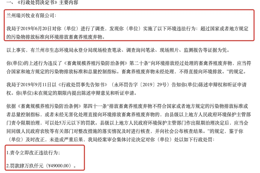 然而,庄园牧场不止这一家子公司被罚。2019年兰州市生态环境局对庄园牧场全资子公司兰州瑞兴牧业有限公司进行了调查。调查发现其超过国家或者地方规定的污染物排放标准向环境排放畜禽养殖废弃物,因此兰州市生态环境局罚款49000元,并要求及时整改其违法行为。