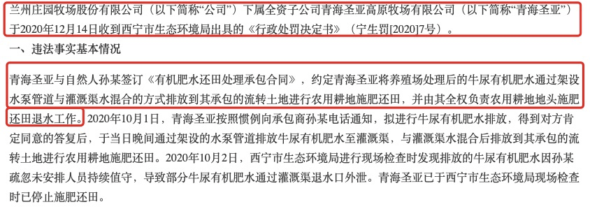 庄园牧场发布的公告显示,2020年12月14日,公司下属全资子公司青海圣亚因私设暗管,利用暗管排放养殖废水收到西宁市生态环境局出具的《行政处罚决定书》。