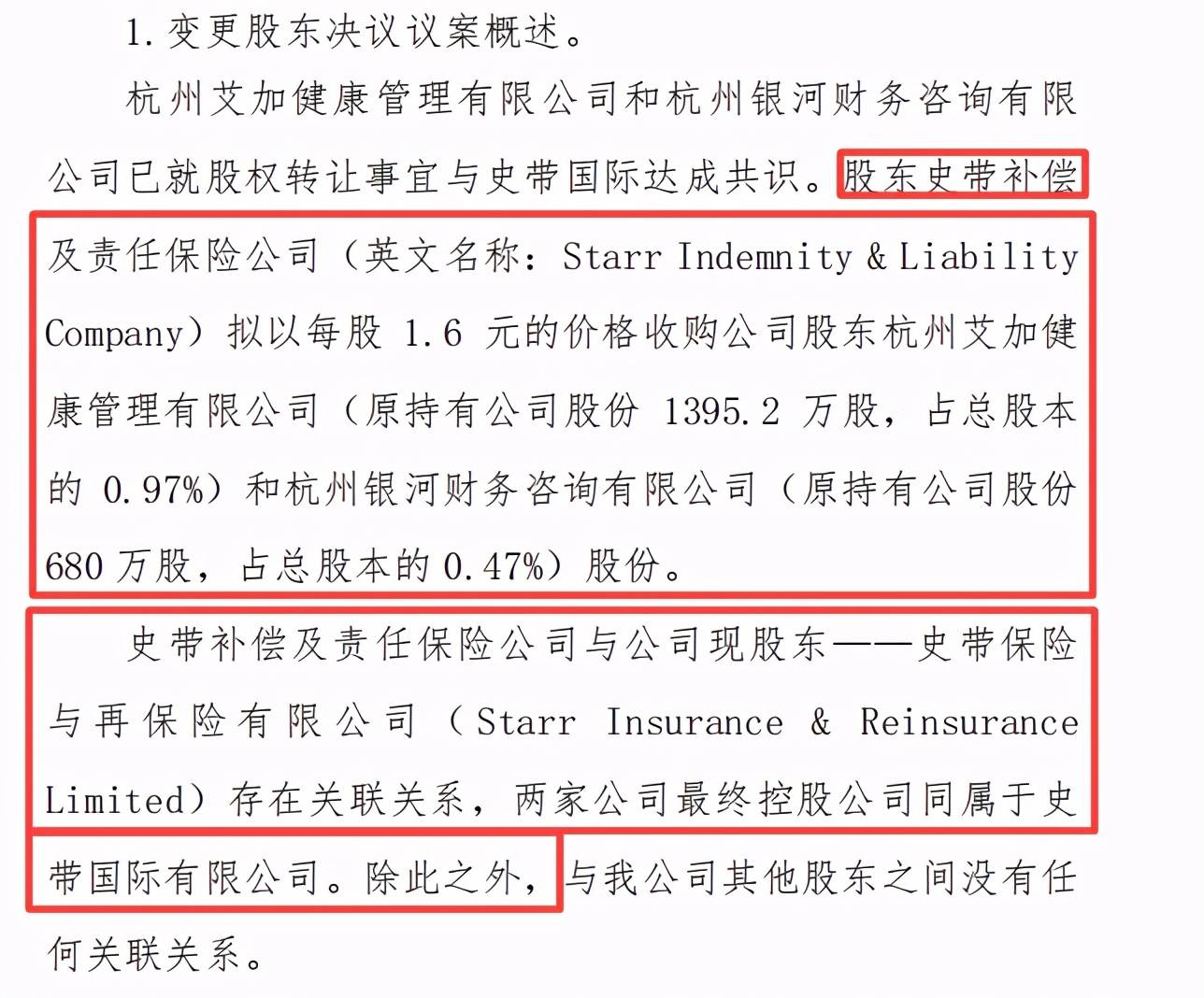 2020年12月,史带财险在其官网披露,公司原股东艾加健康管理和银河财务咨询已就股权转让事宜与史带国际达成共识。股东史带补偿及责任保险公司拟以每股1.6元的价格,收购艾加健康管理1395.2万股股份和银河财务咨询680万股股份,两家公司股份占总股本的0.47%。