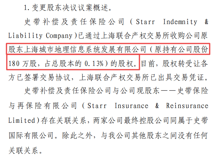 不仅如此,发现网梳理发现,2020年4月史带财险还发生了一次股权变动。史带补偿及责任保险公司已通过上海联合产权交易所收购公司原股东城市地理信息180万股,占总股本的0.13%。