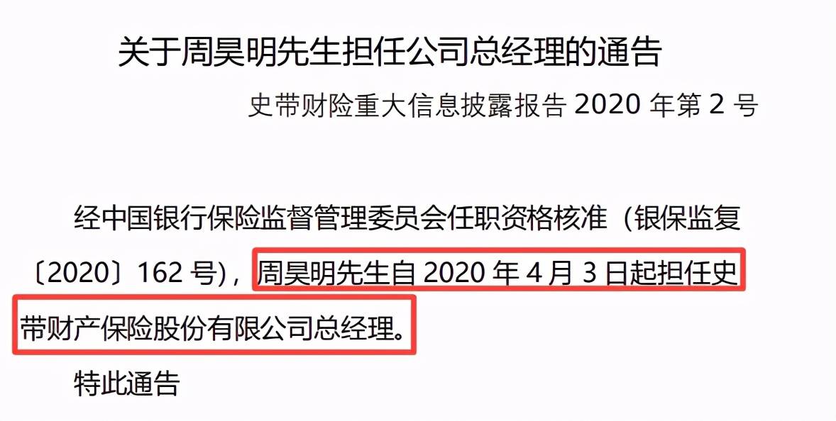 然而好景不长,1月27日史带财险发布重大信息披露公告称,根据公司召开的股东大会和董事会第一次会议分别审议通过,周昊明先生不再担任史带财险董事、总经理职务。而此次周昊明辞职距上次批复时间不到一年。
