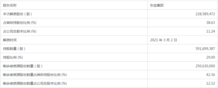 公告还披露,3月2日,东宝集团在中国证券登记结算有限责任公司上海分公司办理了将质押给中国建设银行股份有限公司吉林省分行的1300万股和中国工商银行股份有限公司通化县支行的2.16亿股无限售条件流通质押解除手续。具体情况如下: