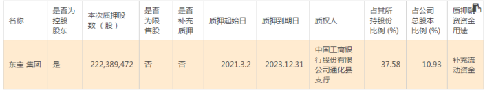 与此同时,3月2日,东宝集团在中国证券登记结算有限责任公司上海分公司办理了将其持有的2.22亿股无限售条件流通股质押给中国工商银行股份有限公司通化县支行的质押手续。具体情况如下: