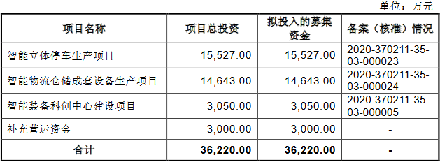 德盛利原拟在深交所创业板公开发行股份数量不超过2033.34万股,不低于发行后总股本的25%。该公司原拟募集资金3.62亿元,其中1.55亿元拟用于智能立体停车生产项目,1.46亿元拟用于智能物流仓储成套设备生产项目,3050.00万元拟用于智能装备科创中心建设项目,3000.00万元拟用于补充营运资金。