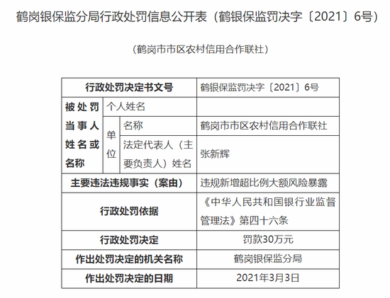 3月4日消息,鹤岗银保监分局公布的行政处罚信息公开表显示,鹤岗市市区农村信用合作联社因关联交易管理不规范;违规新增超比例大额风险暴露,合计被处罚款55万元。