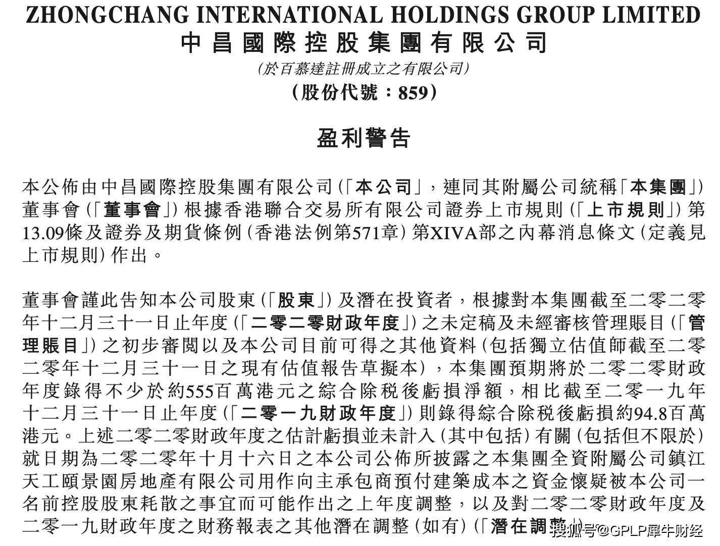 此外,业绩预告显示,中昌国际控股2020财年的估计亏损还有未计入部分,其中包括2020年10月16日,集团全资附属公司镇江天工颐景园房地产有限公司向主承包商预付建筑成本的资金被一名前控股股东耗散的事宜而可能作出的上年度调整,以及对2020财年及2019财年的财务报表的其他潜在调整。