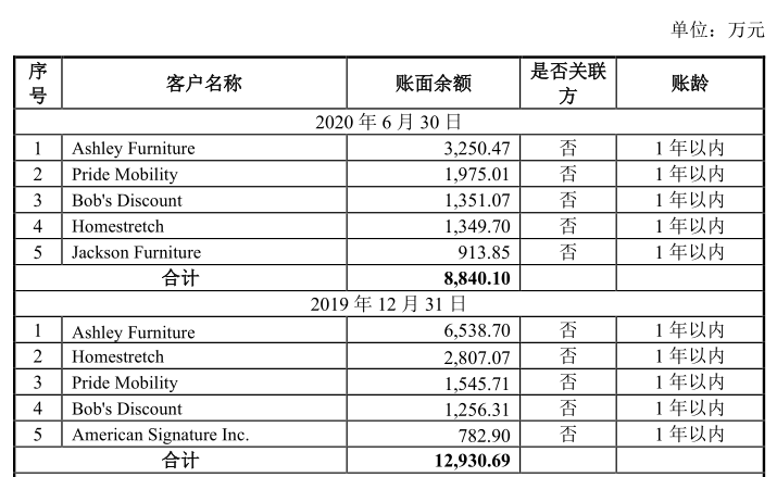 此外,从海外市场看,匠心家居又存在客户集中度过高风险。招股书显示,2017 年-2020年 1-6 月,公司向前五大客户的销售总额占当期营业收入的比例分别为 60.36%、63.40%、60.63%和 64.81%,占比较高且整体仍处于持续增长趋势。