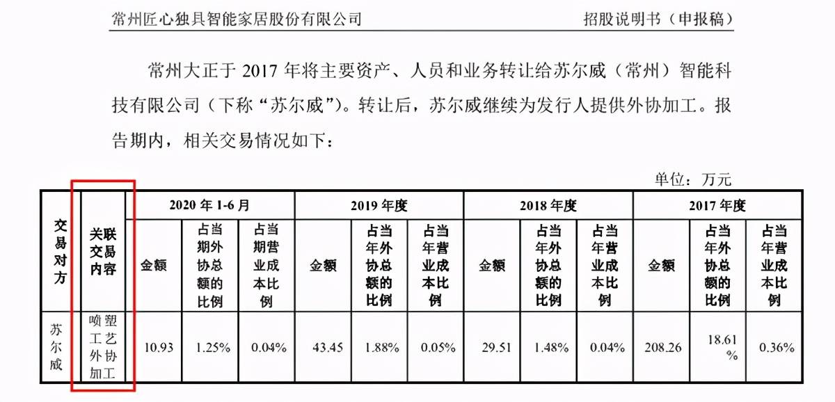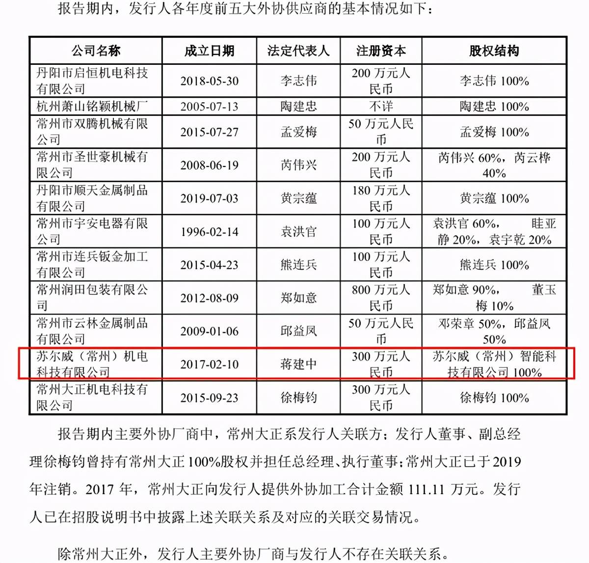 招股书中第205页披露称,除常州大正外,主要外协厂商与匠心家居不存在关联关系,其中主要外协厂商中即包含苏尔威的全资子公司。