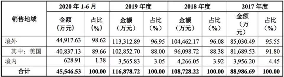 值得关注的是,匠心家居自成立以来主要面向国际市场开展生产经营,虽然该公司在招股书中解释称,公司的客户较为稳定,且不存在对单一客户销售比例超过主营业务收入50%的情况,亦不存在严重依赖于少数客户的情形。但其招股书显示,其客户过于依赖单一国家。