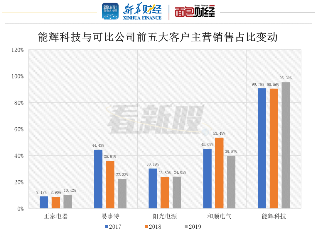 根据招股书,针对主营的电站系统集成业务,能辉科技列举的可比上市公司为晶科科技、正泰电器、易事特、阳光电源以及和顺电气。然而查阅上述公司的前五大客户主营占比情况,除2020年新上市的晶科科技未披露2019年度数据外,其余4家公司2017至2019年的前五大客户主营销售占比均明显低于能辉科技。