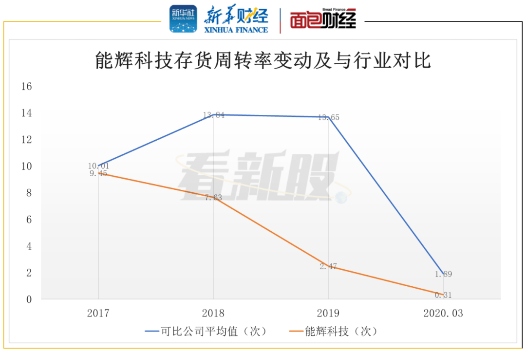 另一方面,2017年至2020年一季度能辉科技的存货周转率分别为9.45次、7.63次、2.47次和0.31次,呈逐年下降趋势,且持续低于可比公司均值。