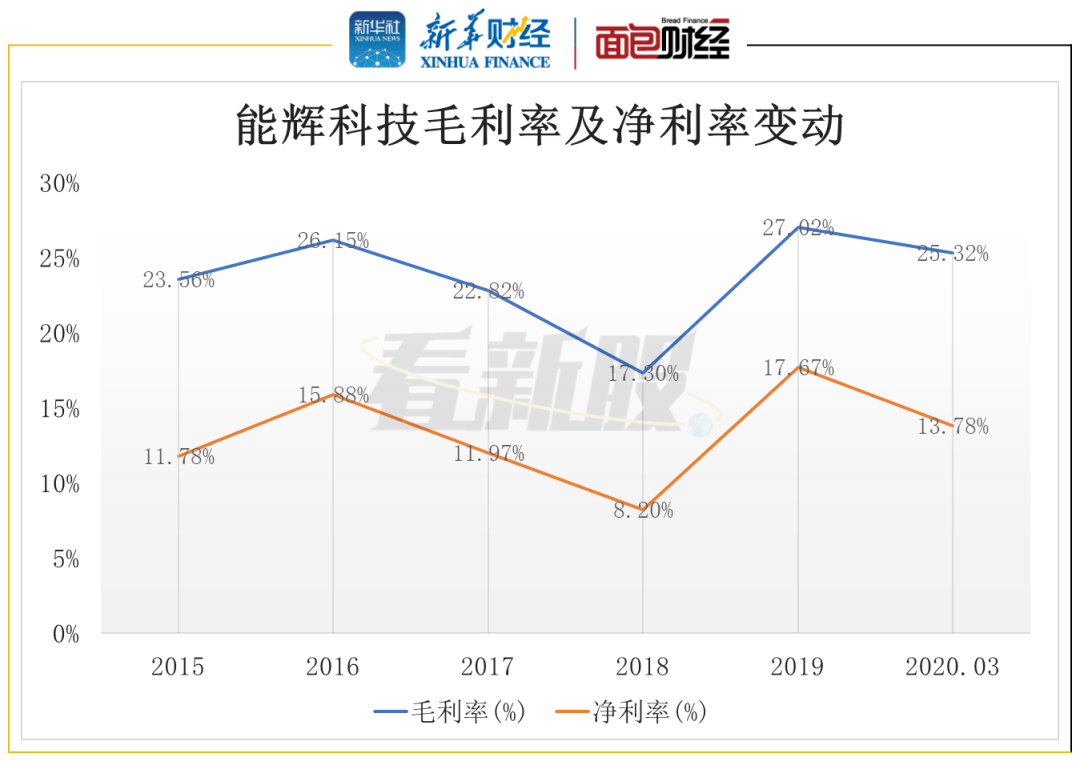 图2:能辉科技2015年至2020年一季度毛利率及净利率变动