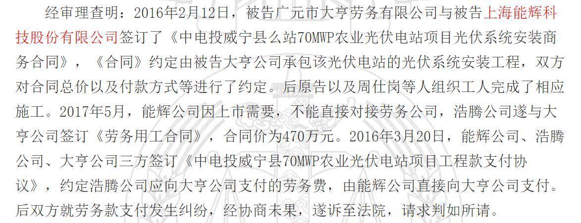 不过,记者注意到,以贵州省第一个农光互补光伏电站项目——能辉科技所谓的“标杆性项目”——威宁县么站60MWp农业光伏电站项目来说,贵州省威宁县人民法院2019年11月出具的一份裁判书显示,能辉科技将该光伏电站的光伏系统安装工程承包给了广元市大亨劳务有限公司(以下简称大亨公司)。