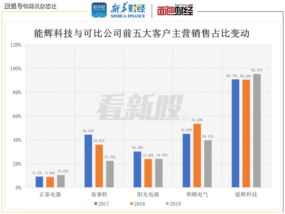 能辉科技表示,公司客户集中度较高符合行业共性。根据其招股书,对于电站系统集成业务,能辉科技列举了晶科科技、正泰电器、易事特、阳光电源以及和顺电气作为可比公司,而经公开资料整理,除了2020年新上市的晶科科技未披露2019年数据,其他4家公司所披露的主营销售占比情况均与能辉科技有较大差距。