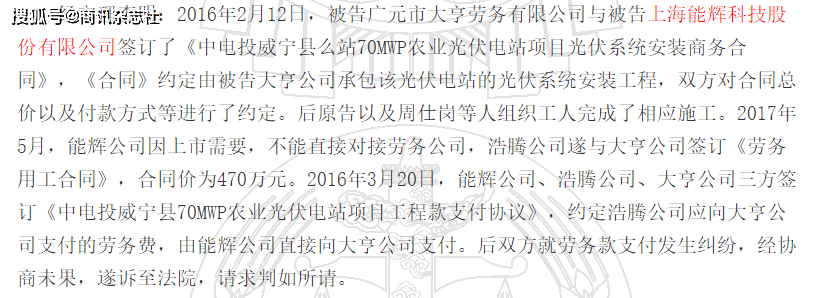 此外,有资料显示,能辉科技可能存在违法分包行为。2020年3月,裁判文书网发布一则劳务款纠纷案件。资料显示,能辉科技将该光伏电站的光伏系统安装工程承包给了广元市大亨劳务有限公司(以下简称大亨公司),大亨公司作为一家劳务公司,业务包括一些工程项目的劳务分包,但其并没有相关施工总承包资质,或是对应的建筑业企业施工资质。