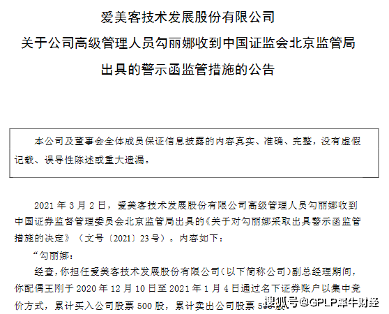 3月2日,爱美客(300896.SZ)高级管理人员勾丽娜收到北京监管局出具的警示函。经查,在勾丽娜担任爱美客副总经理期间,勾丽娜的配偶王刚于2020年12月10日至2021年1月4日通过名下证券账户以集中竞价方式,累计买入爱美客股票500股,累计卖出爱美客股票500股,构成短线交易行为。