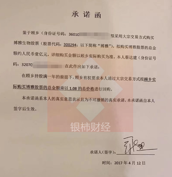 同时据王明透露,2017年4月12日,蔡达建还私下与自然人顾乡签署承诺函,由顾乡采用大宗交易方式购买博雅生物股票,总金额约1亿元,蔡达建承诺在顾乡持股满一年的前提下,有权要求蔡达建通过大宗交易方式按顾乡实际购买博雅股票的总金额乘以1.08的总价格进行回购。对此,王明提供了一份带有签名的承诺函。