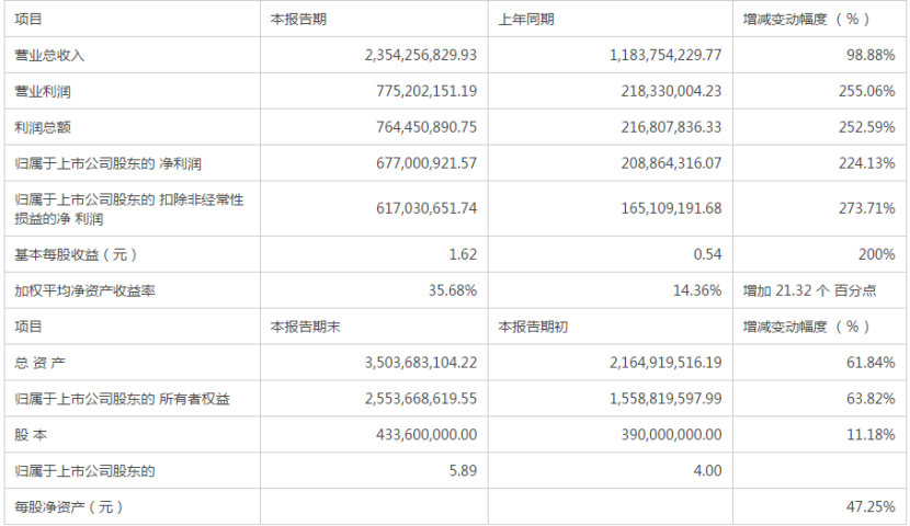 3月4日,万泰生物发布了2020年业绩快报,该公司实现营业收入23.54亿元,比上年同期增长98.88%%;营业利润7.75亿元,比上年同期增长255.06%;利润总额7.64亿元,比上年同期增长252.59%;2020年归属于上市公司股东的扣非前和扣非后的净利润分别为6.77亿元和6.17亿元,比上年同期增长224.13%和273.71%;2020年度公司实现基本每股收益约为1.62元,比上年同期增长200%。