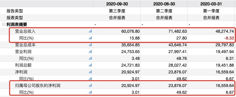 Wind数据显示,2020年三季度的销售毛利率为58.92%,同比下滑1.04%。