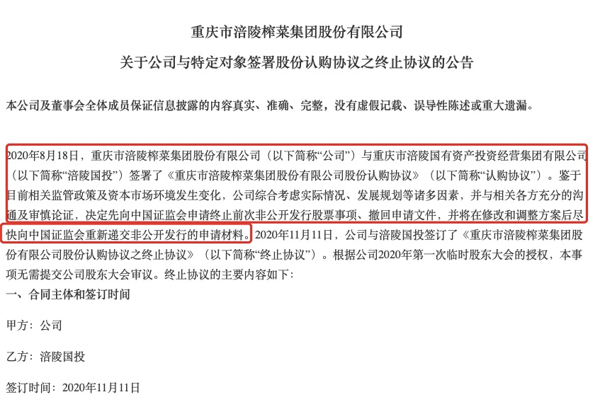 2020年11月12日,涪陵榨菜宣布,鉴于目前相关监管政策及资本市场环境发生变化,公司综合考虑实际情况、发展规划等诸多因素,并与相关各方充分的沟通及审慎论证,决定调整2020年非公开发行股票方案, 并与控股股东涪陵国投签订了有关《股份认购协议之终止协议》,发行对象全部改为特定对象,其他要素不变。