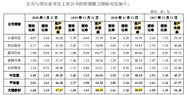 大通新材称由于融资渠道单一,但为抓住市场机遇,报告期内电磁线研发、生产和销售主业持续扩张,盈利能力稳定提升,公司只能充分利用自身经营积累和良好的银行融资能力实现自身发展,报告期各期末,公司资产负债率分别为54.30%、50.99%、48.49%和 47.67%。同行业可比公司平均值分别为47.57%、41.3%、44.28%、46.3%,资产负债率均高于同行业可比公司平均值,偿债能力弱于同行。