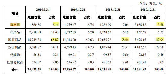 报告期各期末,大通新材存货的账面价值分别为1.56亿元、1.82亿元、1.9亿元和 2.54亿元,占当期资产总额比例分别为11.02%、12.43%、13.47%和 18.06%。其中原材料占比分别为13.38%、7.04%、6.74%和6.14%;库存商品占比分别为47.95%、58.44%、59.63%和65.87%。2018 年末,公司库存商品较上年末增长3,179.65万元,增幅为42.53%。