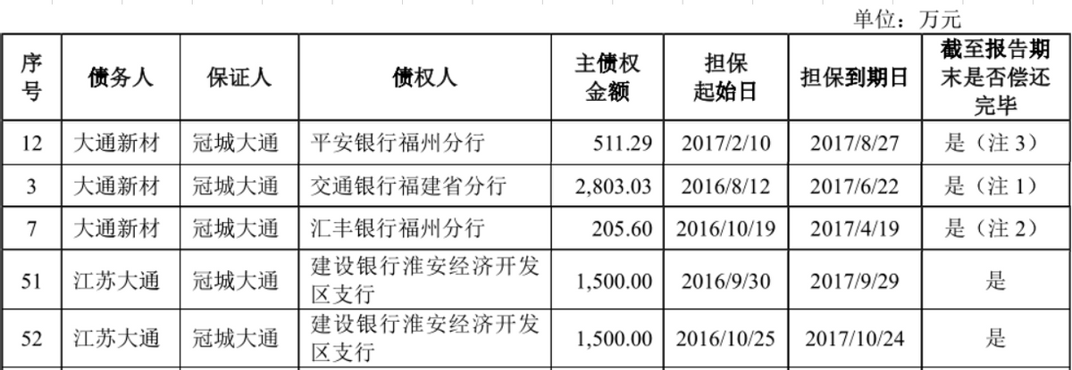 《商务财经》在梳理分拆预案时发现,大通新材涉及的关联担保中,分拆预案披露88份关联担保,招股书披露95份担保,除2020年新增关联担保外,报告期内,招股书中有下述5份关联担保在分拆预案中没有显示。
