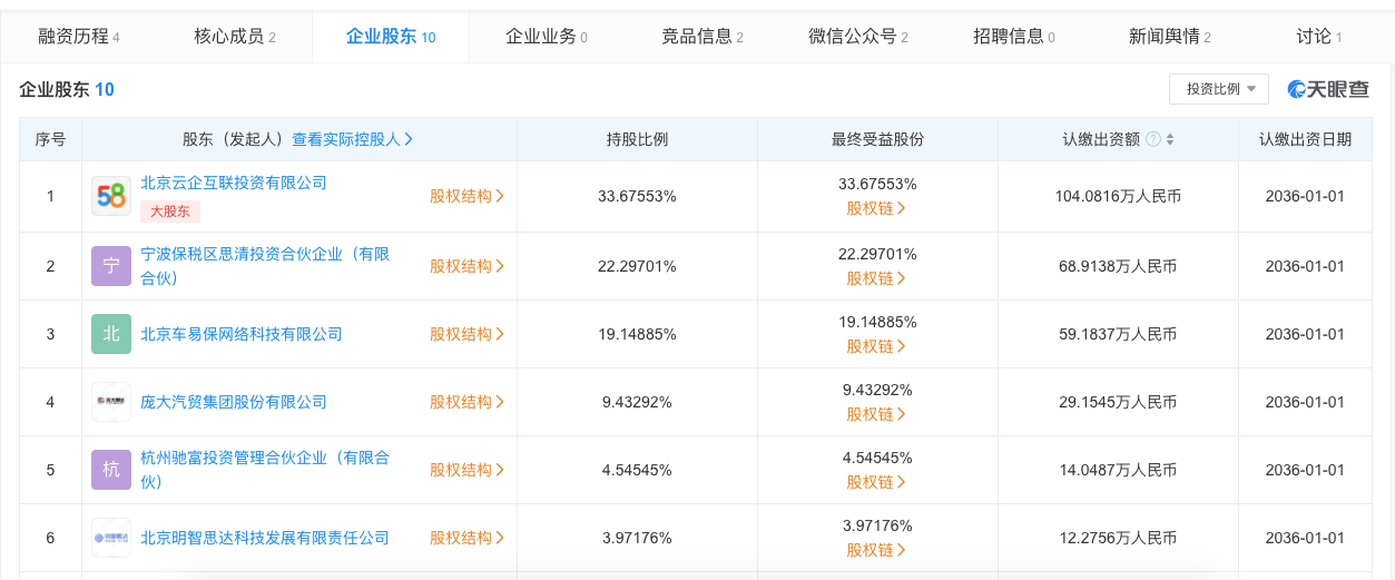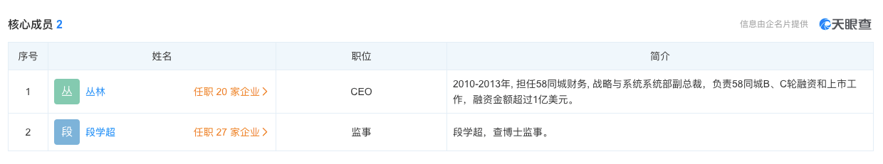 天眼查App显示,查博士CEO丛林,曾在2010-2013年期间担任58同城财务, 战略与系统系统部副总裁,负责58同城B、C轮融资和上市工作。