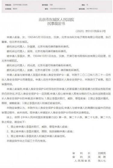 2020年4月,李国庆主导了一出“夺章”大戏,当当网内斗闹剧再次升级,双方围绕股权、公司管理权、架构及人事调整等展开多轮隔空对战,并因此惊动警方。同年6月,李俞二人离婚案再次开庭;8月,俞渝称自己第二次向东城法院提起人身保护令申请,而这份民事裁定书就是法院对俞渝申请人身保护令的审查结果。