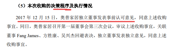 此外,收购的程序存在瑕疵。12月14日奥普家居就对资产进行盘点,确定了最终交易价格,然而12月15日独立董事才发表意见同意收购。更为奇怪的是,该笔收购没有经过审计和评估,后来也没有履行相关审计、评估程序。