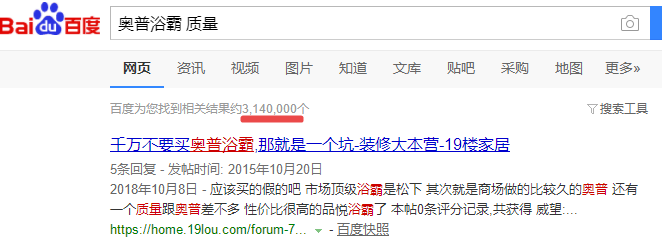 时间财经在百度搜索“奥普浴霸 质量”发现,共出现314万结果,奥普浴霸质量问题被消费者极大关注。