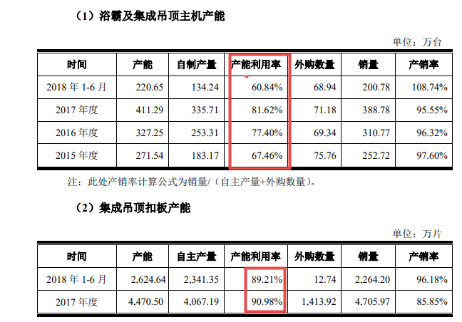 除了产品质量问题,时间财经还发现奥普家居存在产能不足、资金充裕、无融资必要等问题。招股说明书显示,公司产能利用率不足,主要产品浴霸及吊顶主机产能利用率近期只有60.84%,集成吊顶扣板不足90%,二者均不能达产。