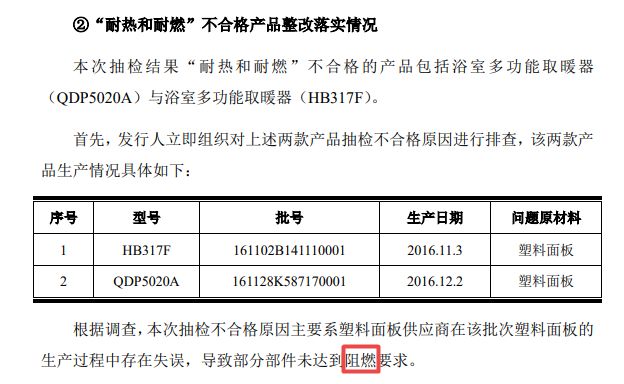 招股说明书还显示,奥普家居产品质量出现不合格问题,部分部件未达到“阻燃”要求。