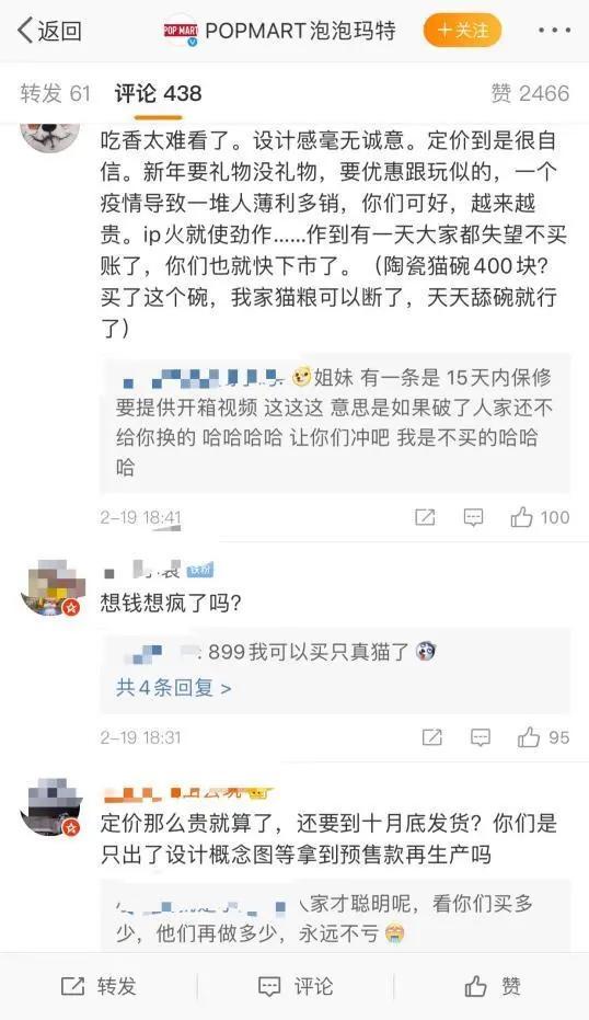 而泡泡玛特上月发布的DIMOO蓝三花陶瓷碗,在公众号与微博上不同的反应,让消费者“上头”与“脱坑”之间的界限更为明显。前者是一片欢呼雀跃,期待新品;后者是吐槽价格虚高,并认为毫无诚意。