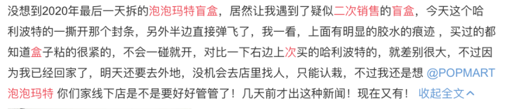 去年12月,有网友爆料称,其在泡泡玛特门店购买了三个盲盒,回家后发现上面封盒处均有黄色胶水,属于二次销售。该事件被泡泡玛特官方确认属实。此后不久,同样有网友遭遇“疑似二次销售的盲盒”,并发文表示“只能认栽”。
