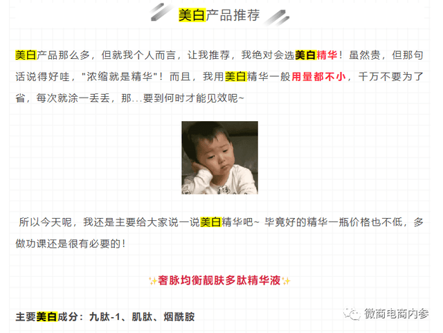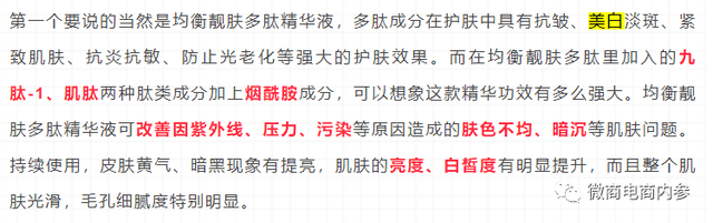 再说回产品宣传方面,综上所述,上面这些挂着奢脉牌子的化妆品所具有的资质都是国产非特殊用途化妆品,但在公众号“奢脉颜究院”的一篇题为《护肤界“美白骗局”大揭露,听我的,这些才是真正美白的方法!!》的文章的宣传下,“奢脉均衡靓肤多肽精华液”、“奢脉均衡肌底精华液”都成了美白产品,都具有了美白成分。