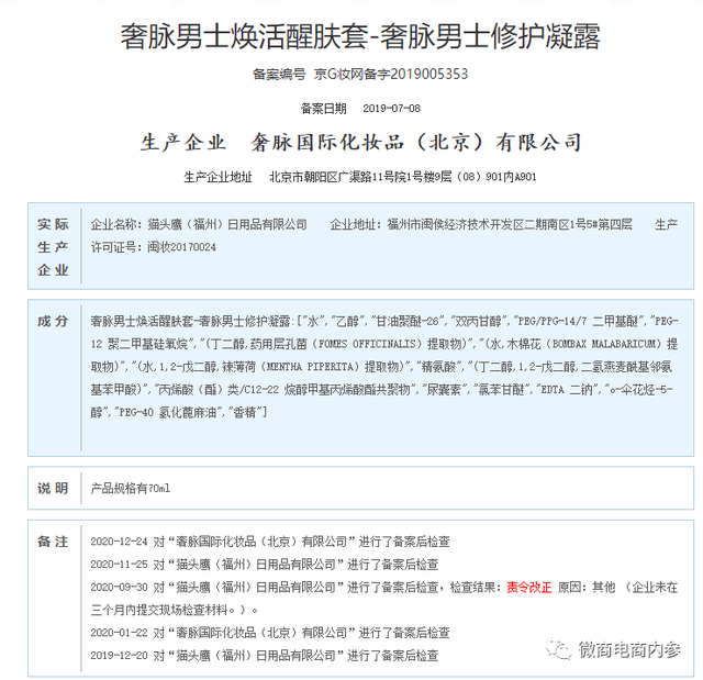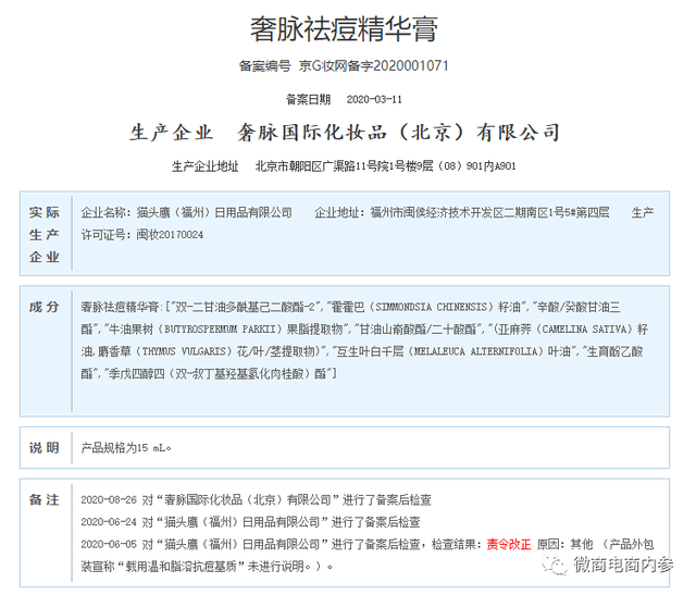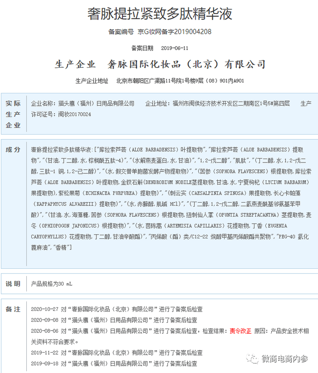 至于一直致力于打造中国女性专属的私人定制高端护肤产品的奢脉在今后会如何发展?猫头鹰(福州)日用品有限公司还会不会再度登上质检黑榜?对此,微商电商内参将继续保持关注。