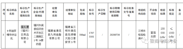7.同年4月10日,“福建省2020年化妆品监督抽验结果公告(第一期) ”名单公示,标示为猫头鹰(福州)日用品有限公司生产的9利油茶精华沐浴乳结果不符合规定。