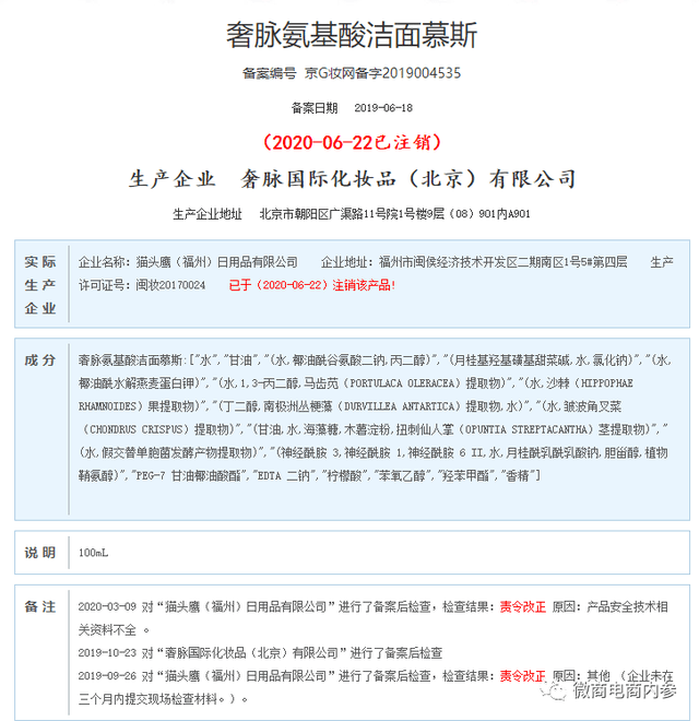文章的最后,我们再来关注一下奢脉旗下的化妆品本身。经查国产非特殊用途化妆品备案平台,我们还发现挂着奢脉牌子的“奢脉男士焕活醒肤套-奢脉男士修护凝露”、“奢脉男士焕活醒肤套-奢脉男士焕活精华霜”、“奢脉极地修护面霜(滋润型)”、“奢脉舒缓肌底油”、“奢脉倍润修护面霜(已注销)”、“奢脉轻盈修护面霜(已注销)”、“奢脉樱桃发酵养肤面膜(已注销)”、“奢脉水凝净润卸妆乳(已注销)”、“奢脉平衡能量水”、“奢脉娇柔润颜养肤水(已注销)”、“奢脉轻透平衡爽肤水(已注销)”、“奢脉焕活滋养面膜(已注销)”、“奢脉红酒雪肌透亮面膜”、“奢脉魅色臻润丝绒口红(已注销)”、“奢脉轻盈修护乳液(已注销)”、“奢脉清爽水润洁面乳(已注销)”、“奢脉清肌矿物黑泥面膜(已注销)”、“奢脉均衡肌底精华液(已注销)”、“奢脉轻龄淡纹精华液(已注销)”、“奢脉·小奢红酒多酚水润雪肌面膜(已注销)”、“奢脉平衡赋活乳”、“奢脉4D玻尿酸水润面膜(已注销)”、“奢脉极地舒润护手霜(已注销)”等多款产品都曾遭到过责令改正,原因同样为“企业未在三个月内提交现场检查材料”。