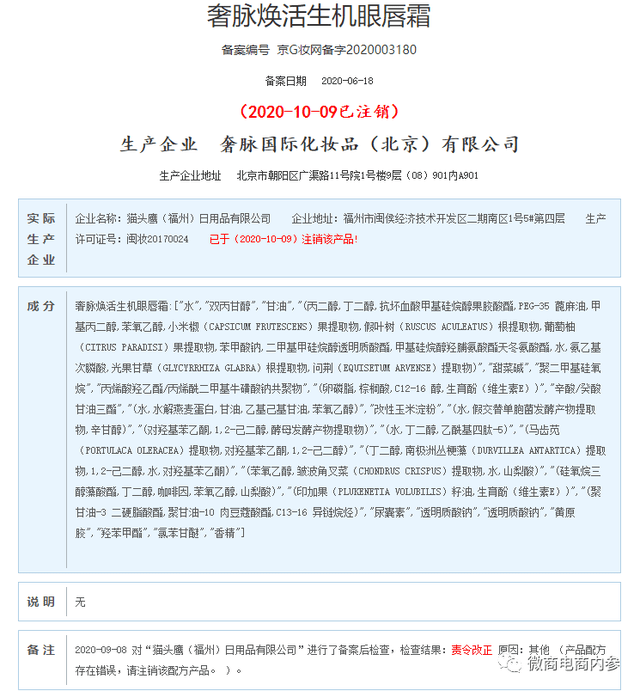 “奢脉焕活生机眼唇霜(已注销)”遭到责令改正的原因为“产品配方存在错误,请注销该配方产品”。