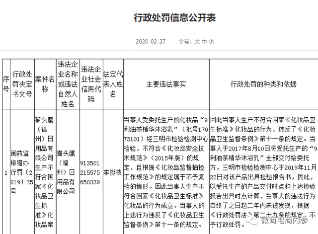 6.2020年2月27日,福建省药品监督管理局发布“闽药监榕稽办行罚〔2019〕35号”行政处罚信息公开表,猫头鹰(福州)日用品有限公司生产不符合国家《化妆品卫生标准》化妆品案得以公示。