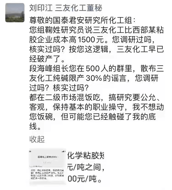 财联社(记者 邹晨辉)讯 三友化工董秘刘印江朋友圈硬怼国泰君安化工组相关研究员的截图在社交媒体传播。
