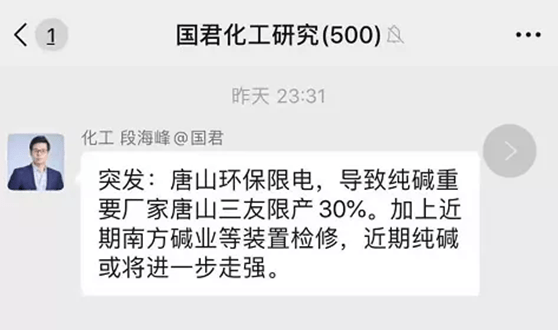 从昨晚纯碱期货昨晚的走势来看,前此市场也在过度释放限产的消息,这也意味着,向市场散播相关消息的,并非国君一位研究员,而国君研究员恰好在晚间23:31分发布了相关消息,也由此遭遇董秘硬怼。