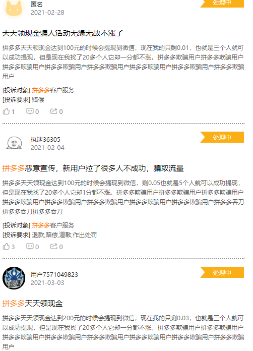 为获取流量,拼多多的手法比较激进,也引起消费者大量投诉。某消费者投诉平台显示,有关拼多多的投诉多达20万条,而京东、淘宝有超10万条,美团则不到5万条。