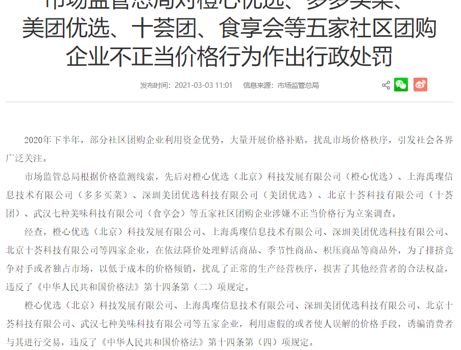 值得注意的是,3月3日,包括多多买菜、橙心优选、美团优选等社区平台因不当市场价格竞争被市监局合计罚款650万元 。