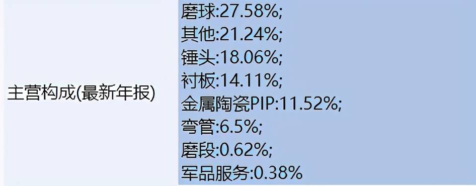 2019年年报显示,华民股份业务构成分布平均,没有特别依赖某一业务,磨球占比27.58%、锤头18.06%,其他业务占比21.24%,此外还有衬板、金属陶瓷PIP等占比也相对较大。