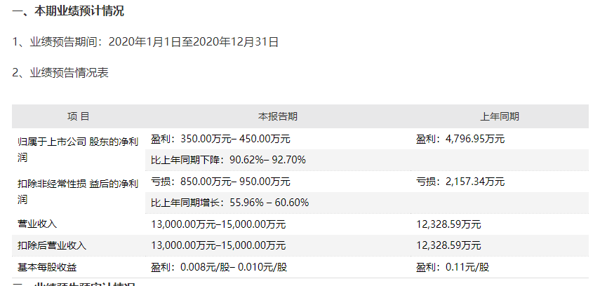 从华民股份发布的业绩预告来看,2020年华民股份归属于上市公司股东的净利润盈利350万元–450万元,比上年同期(盈利4796.95万元)下降90.62%–92.70%;扣除非经常性损益后的净利润亏损850万元–950万元,比上年同期(亏损2157.34万元)增长55.96%–60.60%。